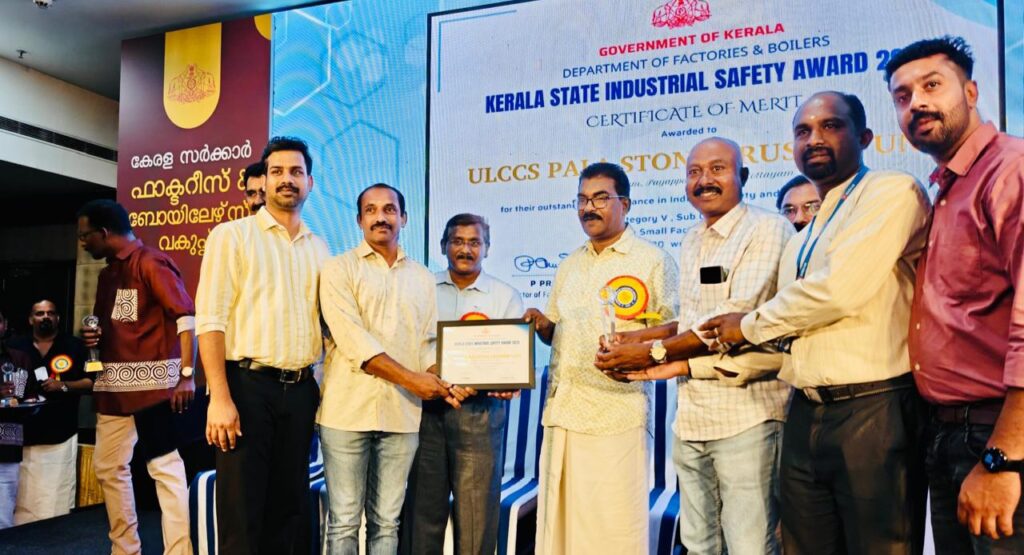 Caption:കേരള ഫാക്റ്ററീസ് ആൻഡ് ബോയിലേഴ്സ് വകുപ്പിന്റെ 2025-ലെ ‘കേരളസംസ്ഥാന വ്യാവസായികസുരക്ഷിതത്വ അവാർഡ്’ ഊരാളുങ്കൽ ലേബർ കോൺട്രാക്റ്റ് കോ-ഓപ്പറേറ്റീവ് സൊസൈറ്റിയുടെ പാലായിലുള്ള ഇന്റർ ലോക് ടൈൽസ് യൂണിറ്റിനുവേണ്ടി സൈറ്റ് ലീഡർ പി. ടി. പ്രദീപ്, യൂണിറ്റ്സ് മാനേജർ ശരത്ലാൽ, എൻവയമെന്റ് മാനേജർ ബി. രാജേഷ്, എഫ് ആൻഡ് ഇ സീനിയർ എക്സിക്യൂട്ടീവ് എ. പി. ജ്യോതിസ്ലാൽ, സീനിയർ അക്കൗണ്ടന്റ് ബിജുകുമാർ എന്നിവർ കേരള ഇൻസ്റ്റിറ്റ്യൂട്ട് ഓഫ് ലേബർ ആൻഡ് എംപ്ലോയ്മെന്റ് ചെയർമാൻ കെ. എൻ. ഗോപിനാഥിൽനിന്ന് ഏറ്റുവാങ്ങുന്നു. ഇരുപതുവരെ തൊഴിലാളികളുള്ള വിഭാഗത്തിൽ കെട്ടിടനിർമ്മാണസാമഗ്രികളുടെ ഉത്പാദനശാലകളുടെ ഉപവിഭാഗത്തിലാണ് ഒന്നാം സമ്മാനം.